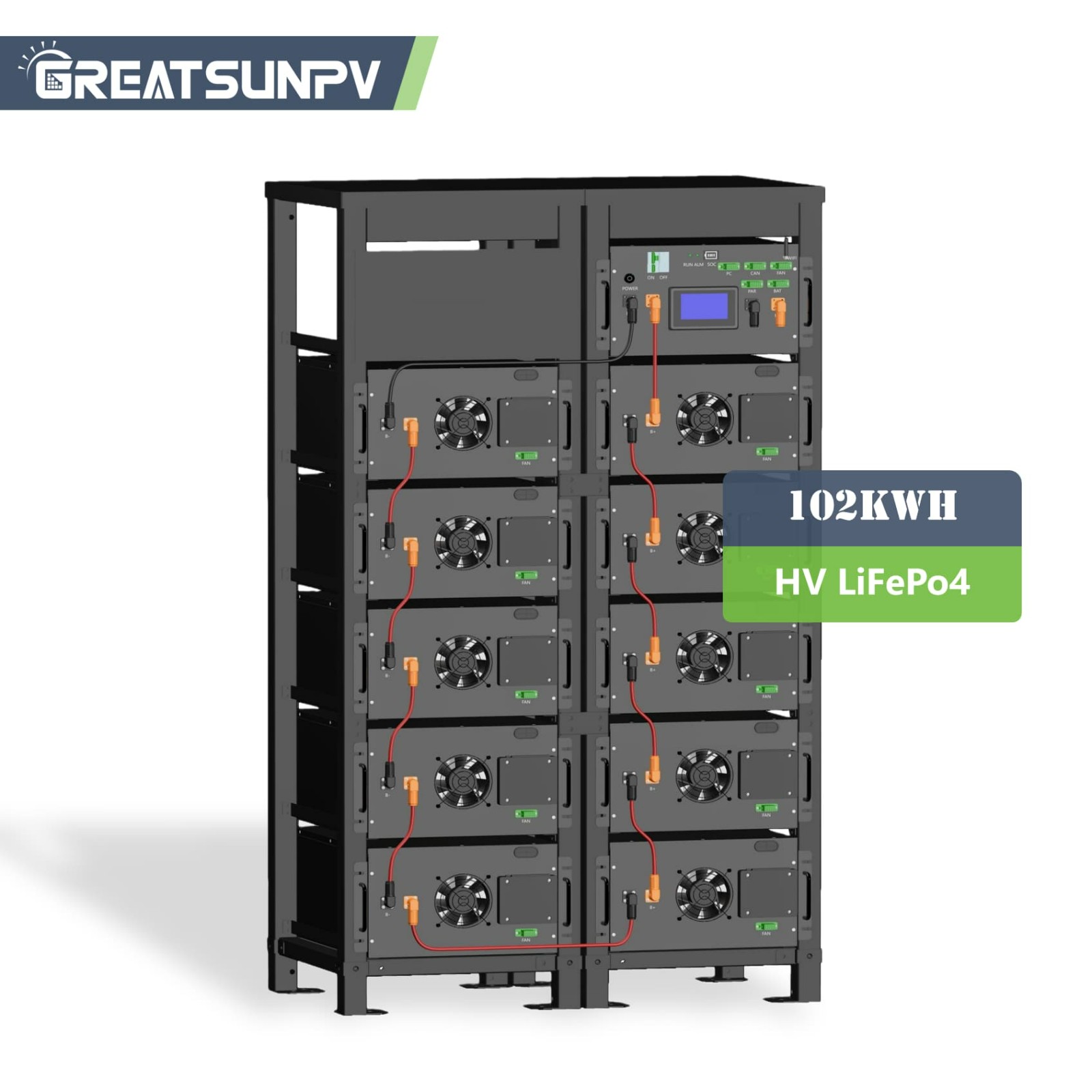With a rugged 10-module high-voltage configuration, the HV-102 integrates a multi-layer intelligent BMS, supported by powerful fan-cooled thermal control and a robust monitoring platform with color display and WiFi.
